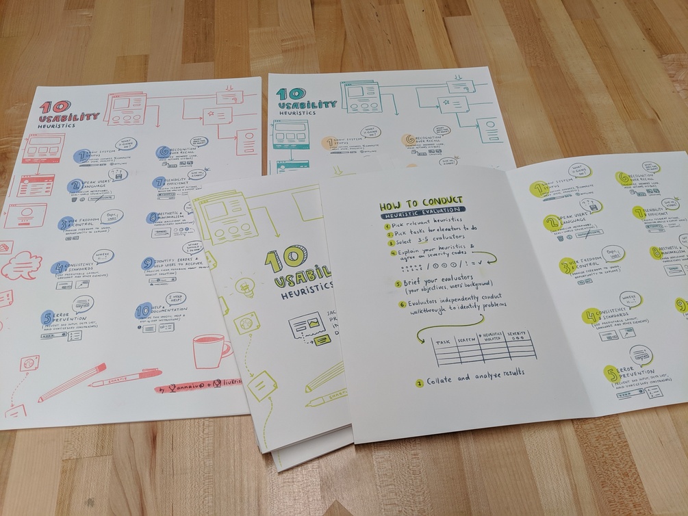 This is a visualization of 10 Usability Heuristics by Jacob Nielsen in poster and brochure format. Brochure version has a quick checklist on how to conduct heuristic evaluation. Feel free to download print it and share!